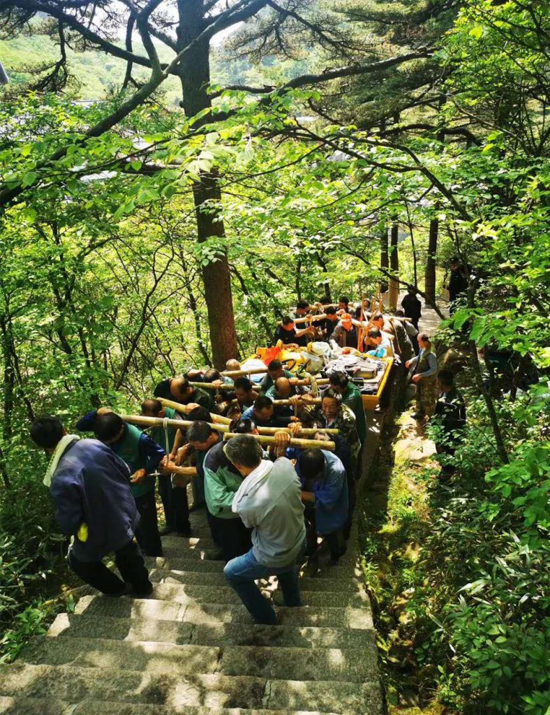 5月18日,全部散装件以手抬肩扛的形式,被逐一运送至山顶;