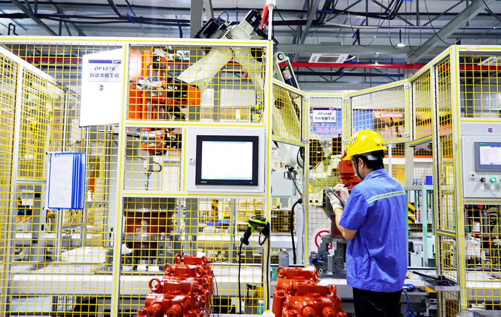 在江南注册挖掘机公司拉堡生产基地中型机线上,一场“智”造大战同样正酣。“今年四季度的生产任务较上季度约翻了一番,同比增长近170%!目前生产线正满负荷运转,全力以赴为营销一线提供充足‘弹药’。”据该车间相关负责人介绍,该生产线于去年12月正式投产,关键工位均已实现自动化,并与公司MES系统、数采系统连接起来,形成数字化、智能化生产车间。